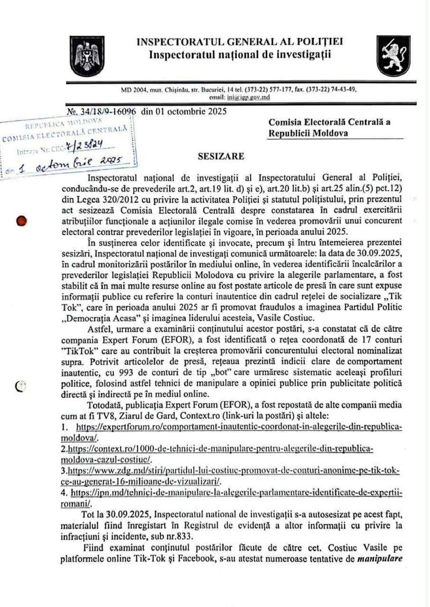 „INI a făcut o constatare în cadrul exercitării atribuțiilor funcționale, vizând acțiuni presupus ilegale comise pentru promovarea unui concurent electoral, contrar prevederilor legale. Mai exact, ar fi fost identificate conturi inautentice pe TikTok care ar fi promovat fraudulos imaginea partidului Democrația Acasă”, a spus Vasile Costiuc. El a accentuat că acuzațiile nu se bazează pe fapte concrete și au apărut abia după anunțarea rezultatelor scrutinului.