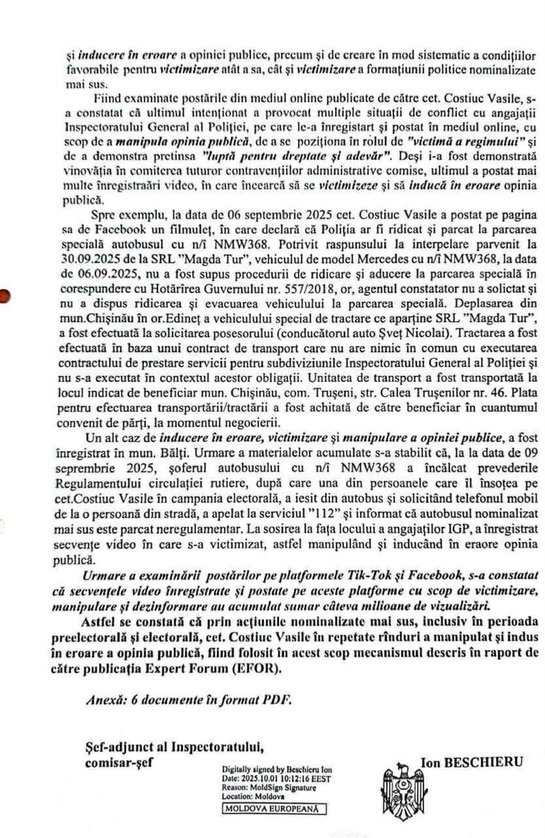 Potrivit vicepreședintelui CEC, Pavel Postică, partidul a fost sprijinit de o rețea coordonată de 17 conturi TikTok, care ar fi generat peste un milion de vizualizări începând cu luna iunie, sub hashtag-ul Vasile Costiuc. Oficialul a subliniat că întreținerea unei asemenea rețele este imposibilă fără resurse financiare, însă acestea nu au fost raportate, ceea ce reprezintă o abatere de la lege.