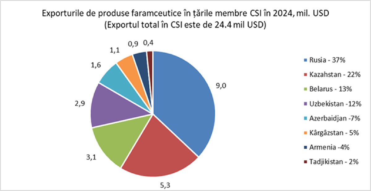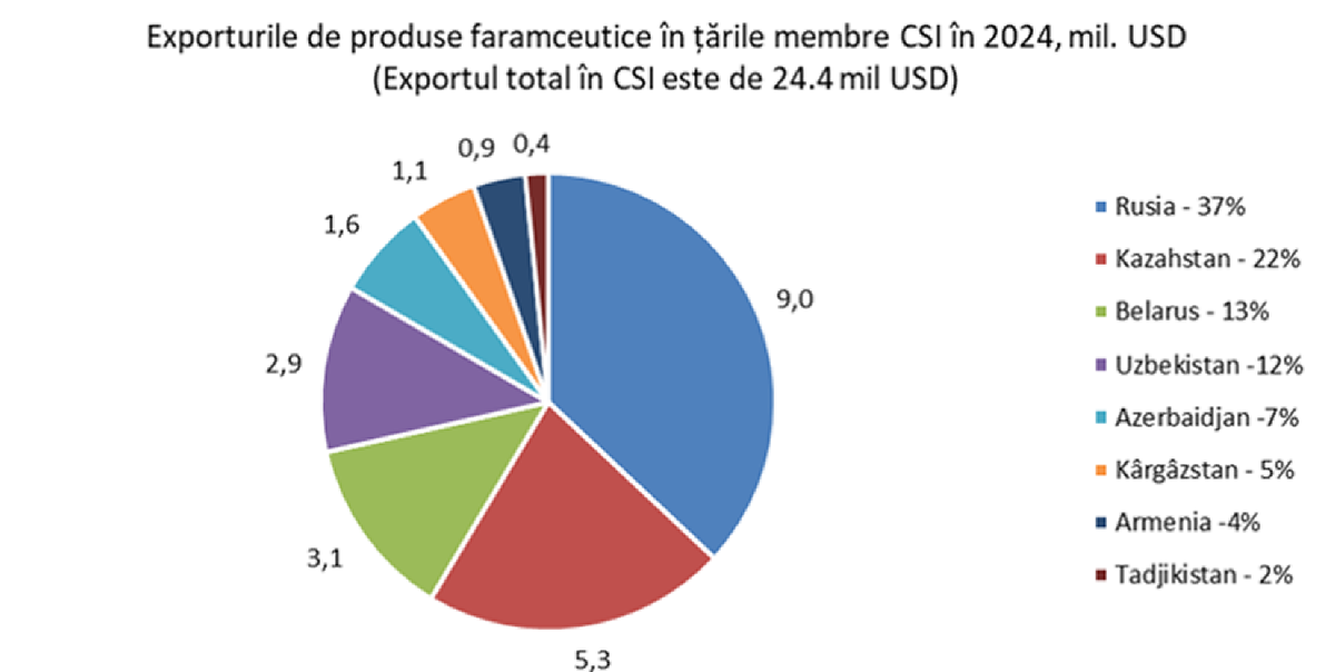 În 2024, conform aceleiași surse, 46% din totalul exporturilor de produse farmaceutice au fost orientate către statele CSI, în valoare de 24,41 mil. USD. Principalele destinații au fost Federația Rusă, cu 9,02 milioane USD, și Kazahstan, cu 5,29 milioane USD.